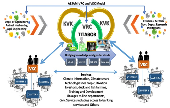 VKC functions as a conduit for information, knowledge, and skill transfer to rural communities. It covers various sectors such as agriculture, animal husbandry, health, education and government programs. VKCs can be accessed by all irrespective of caste, class, gender and or age. Need-based content creation is regularly done on the basis of the need assessment and feedback from the local women and men who visit the centre. The local village people are trained in the management of modern ICT tools, including the operation of computer and hardware maintenance. While the VRC is managed by a professional and able to link with local Krishi Vigyan Kendra’s (KVK), research institutions, line departments especially agriculture, livestock, sericulture, agri business entities etc, private sectors and local and regional markets.
