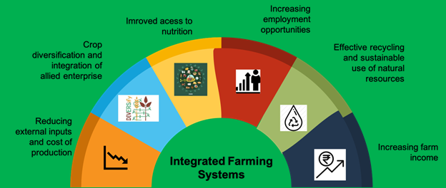 To promote the IFS, efforts have been taken to demonstrate and train the farmers with the multiple objectives of facilitating integration, intensification and diversification of crops and allied sectors and recycle the resources effectively and promote diversified diets.